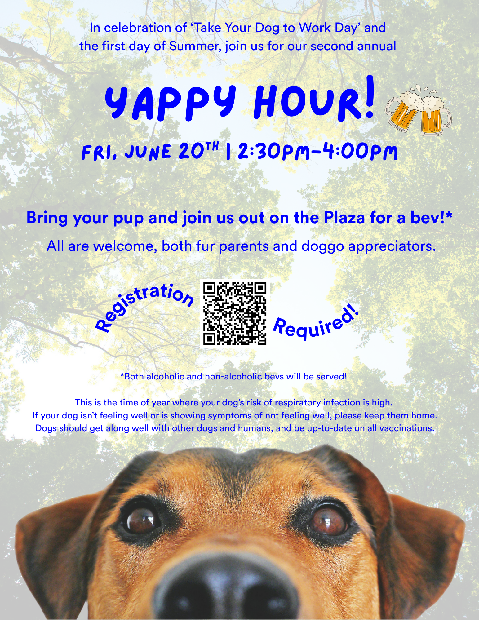 In celebration of ‘Take Your Dog to Work Day’ and the first day of Summer, join us for our second annual Yappy Hour! 🐶 Bring your pup and join us out on the Plaza for a bev! All are welcome, both fur parents and doggo appreciators. *Both alcoholic and non-alcoholic bevs will be served!